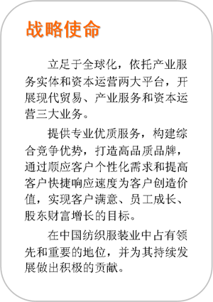 產(chǎn)業(yè)服務(wù)業(yè)是紡織工貿(mào)集團(tuán)在未來五年中加速發(fā)展的戰(zhàn)略業(yè)務(wù),該板塊主要是圍繞著集團(tuán)紡織服裝這一主業(yè),通過整合集團(tuán)資源,提升資源使用效率,獲取產(chǎn)業(yè)鏈競(jìng)爭(zhēng)優(yōu)勢(shì),重點(diǎn)打造廣州T.I.T國際紡織城。