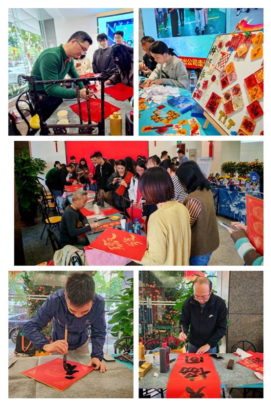 吉祥福手送祝福。在廣德一樓大堂,公司4位書法愛好者張漢彬、李運峰、吳宏景、禤俊峰應(yīng)邀揮墨送福;設(shè)計師黃雨桐巧妙手工制作福字冰箱貼,大堂喜氣洋洋,年味十足,上百名員工參加現(xiàn)場接福活動。福手們凝神靜氣,手腕妙轉(zhuǎn),在一張張紅紙上揮灑自如地書寫“?!弊趾透魇郊榇郝?lián),一個個蒼勁有力或流暢飄逸或趣味可愛的“?!眰鬟f到接福的同事們手上,大家眉開眼笑,幸福綻放。這一傳統(tǒng)習俗承載公司對廣大員工的新年美好祈愿與祝福,場景溫馨而充滿喜悅?;顒蝇F(xiàn)場共送出500多份福字作品。