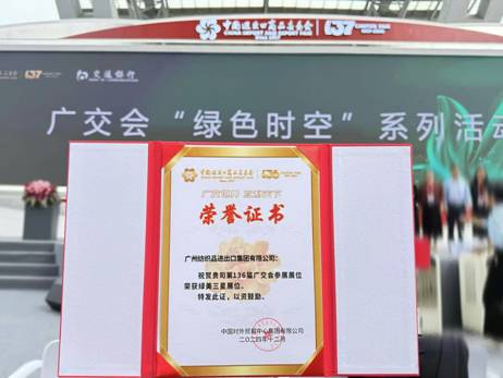廣交會二期展會首日,在大會舉辦的“綠色時空”頒獎儀式上,紡出公司家具展位設(shè)計因突出的環(huán)保理念和創(chuàng)新實踐榮獲“綠美展位優(yōu)秀案例”稱號,公司代表出席并登臺領(lǐng)取了“綠美三星展位”榮譽(yù)證書,彰顯紡出公司在戶外生活領(lǐng)域的創(chuàng)新實力和環(huán)保承諾。