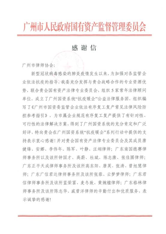 服務(wù):充分發(fā)揮專業(yè)優(yōu)勢,助力復(fù)工復(fù)產(chǎn)。紡織公司汪翊律師作為廣州市律師協(xié)會國有資產(chǎn)法律專業(yè)委員會的成員之一,積極投身廣州國資系統(tǒng)“抗疫暖企”公益法律服務(wù)團,參與編寫了《廣州市國資委監(jiān)管企業(yè)依法有序復(fù)工復(fù)產(chǎn)常見法律風(fēng)險防控參考指引》, 并得到廣州市國資委的誠摯感謝。