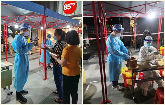 4月28日,正當大家認為廣州新冠病毒肺炎疫情情況已有所好轉,滿懷期待準備迎接“五一”假期之時,不料廣州又有了新增本土確診病例。當天下午荔灣區(qū)金花街負責組織募集核酸檢測志愿者的工作人員撥打手機找到紡織公司屬下廣州化工團干部陳炯龍,負責人說:“小陳,我們街道晚上需要全員核酸,有空來參加嗎?”陳炯龍接到電話后沒有片刻猶豫,立刻答應參加志愿服務。他想著今晚任務一定很重,要是多點人一起參加就好了,畢竟人多力量大。可接到任務時,已臨近下班時間,同事們大多有了各自的安排。他試探性地問了之前和他一樣下沉白云區(qū)支援社區(qū)抗疫工作的團員陳英東是否愿意同行。沒想到同為熱血青年的陳英東也立馬就答應了!