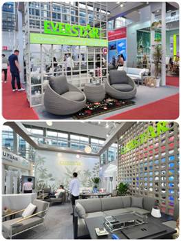 家具展位以低碳環(huán)保、節(jié)能減排為設計理念,淺色系框架為主體,搭配綠植風格的背景展示戶外家具產(chǎn)品,戶外美學的氛圍感瞬間拉滿。