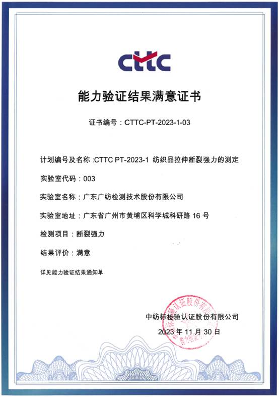 喜報:廣紡檢測參加“拉伸斷裂強力”和“耐洗色牢度”能力驗證結(jié)果滿意