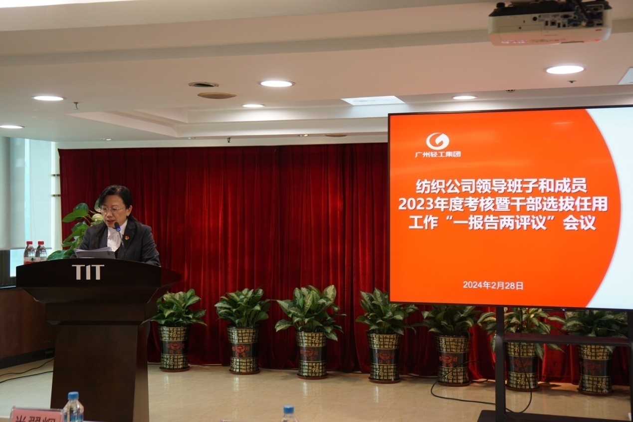 2月28日下午,紡織公司黨委召開領導班子和成員2023年度述職暨干部選拔任用工作“一報告兩評議”會議。會議由紡織公司黨委副書記、工會主席丘海瀾主持。紡織公司領導班子成員、本部中層管理干部、屬下企業(yè)領導班子成員、企業(yè)“一代表兩委員”以及黨員干部群眾代表參加了會議,廣州輕工集團黨委組織部派員出席了會議。